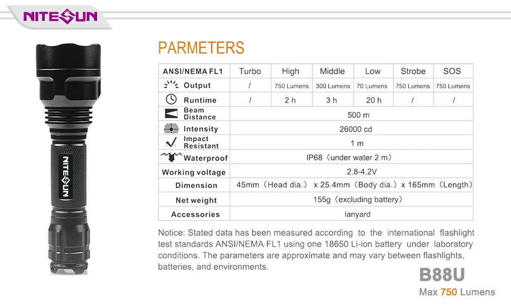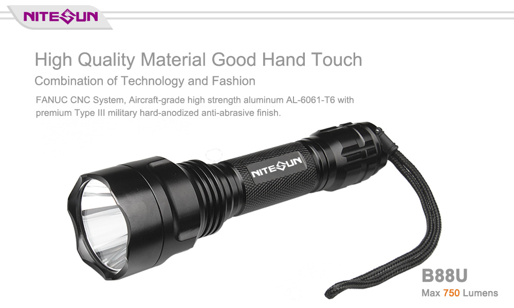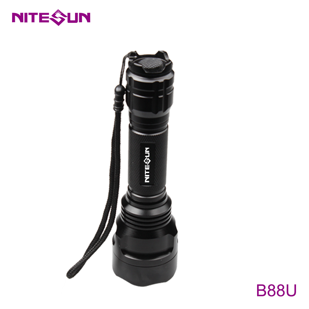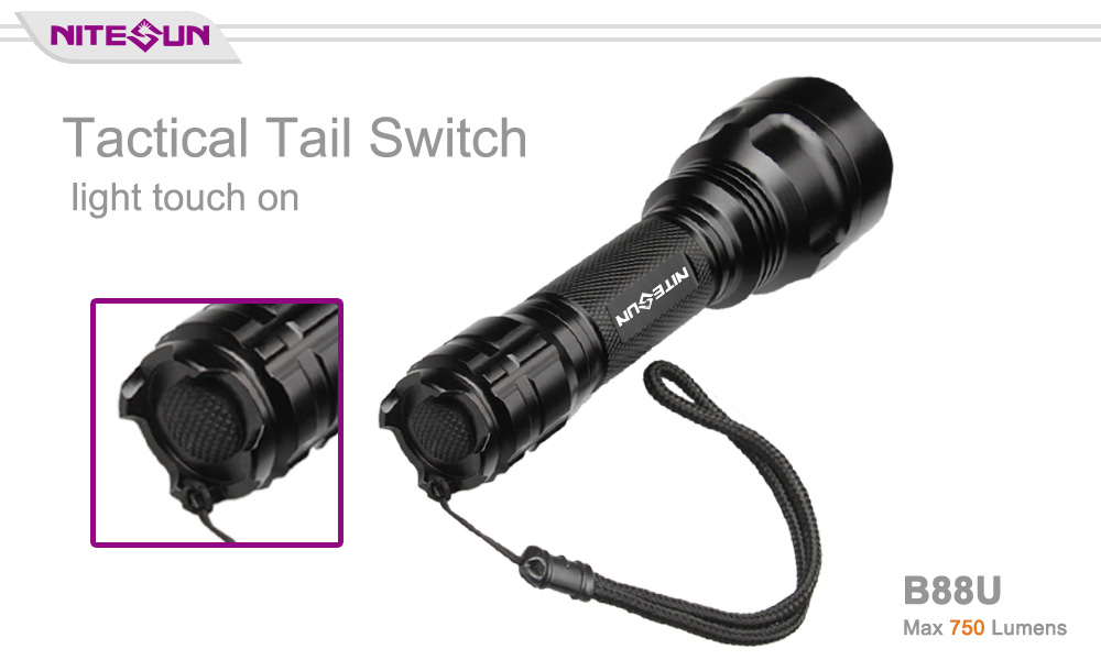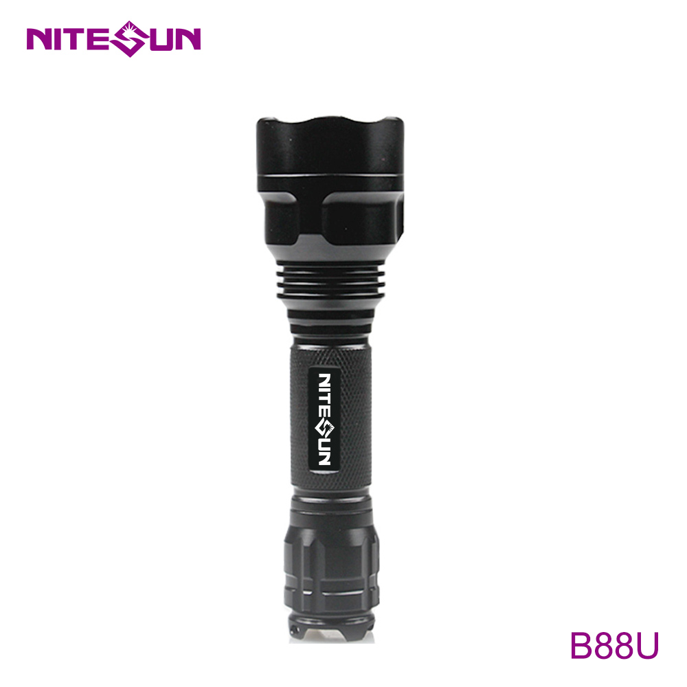 Nitesun B88U night hunting flashlight uses one CREE XM-L2(U4) LED and can reach max 750 lumens output. This flashlight is powered by one 18650 battery with max 20 hours run time. The tail-cap switch offers multiple choices on modes to meet different needs. IPX-8 standard waterproof features and 500 meters long beam distance, Nitesun B88 could be widely used from camping, hiking, hunting, fishing to cycling. It is one of your best choices for long beam shot lighting. Custom service for mode, package, and accessories are available.