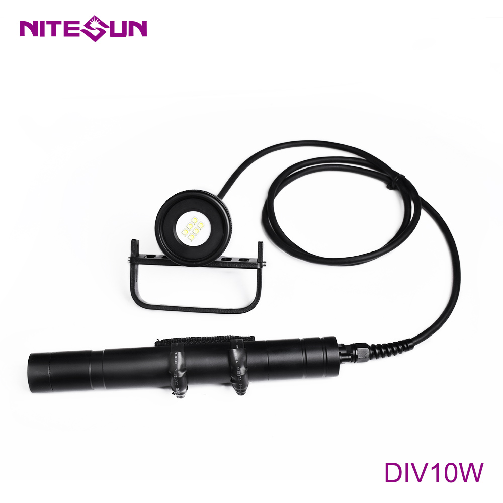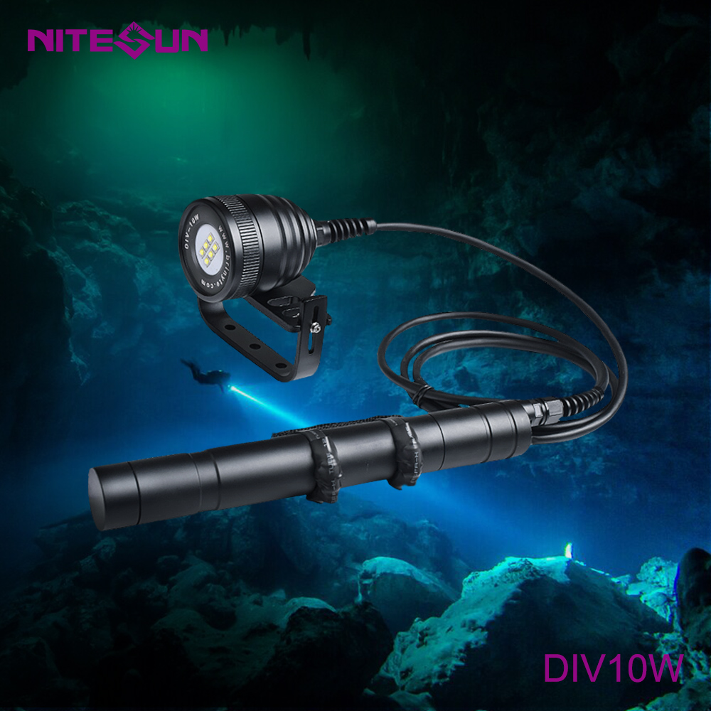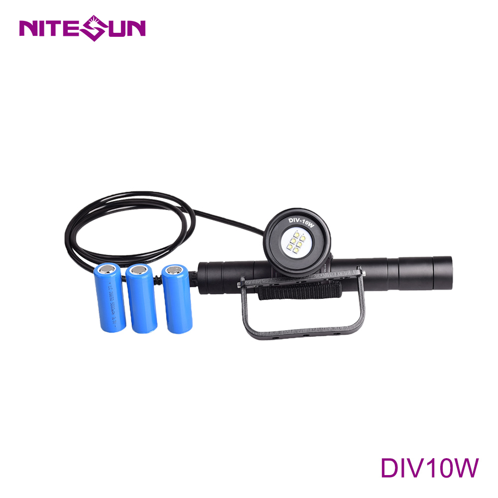 Nitesun DIV10W canister dive video flashlight utilize 6*CREE XM-L2 LED, with max 4500 lumens output, magnetic switch, not only operate easily, also satisfy your multi modes output requirement, powered by 3*26650 lithium batteries, with max 1.5 hours runtime at high mode. Rate to the 200m depth underwater and three O-rings good sealing construction, plus 120°excellent beam angle, it is one of the powerful primary lights for you to enjoy the amazing underwater world.