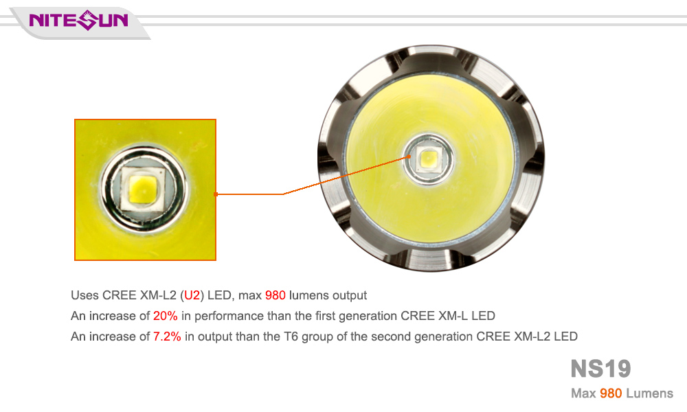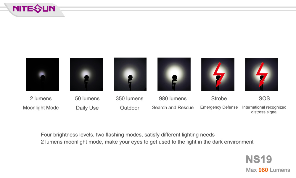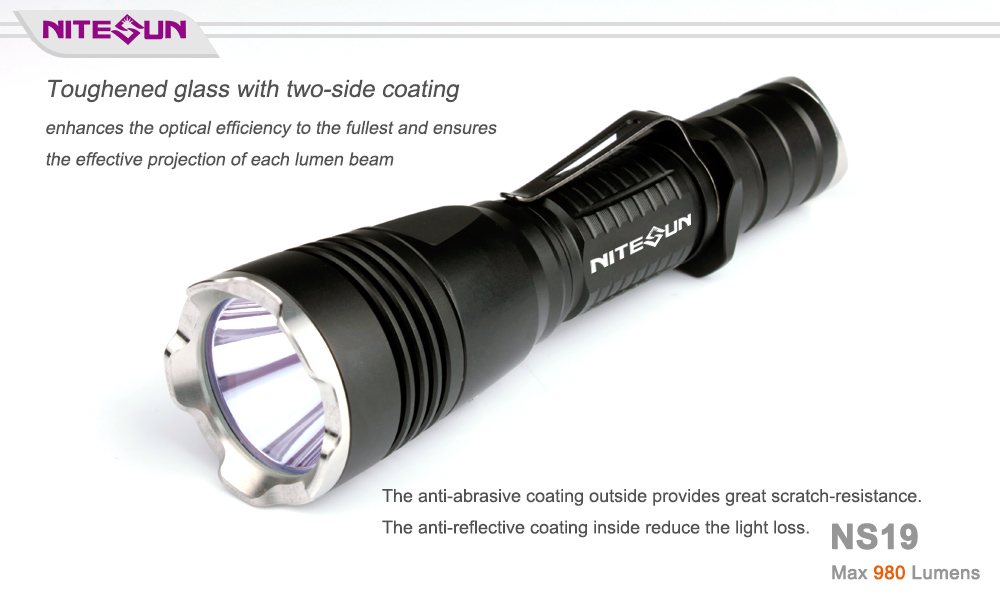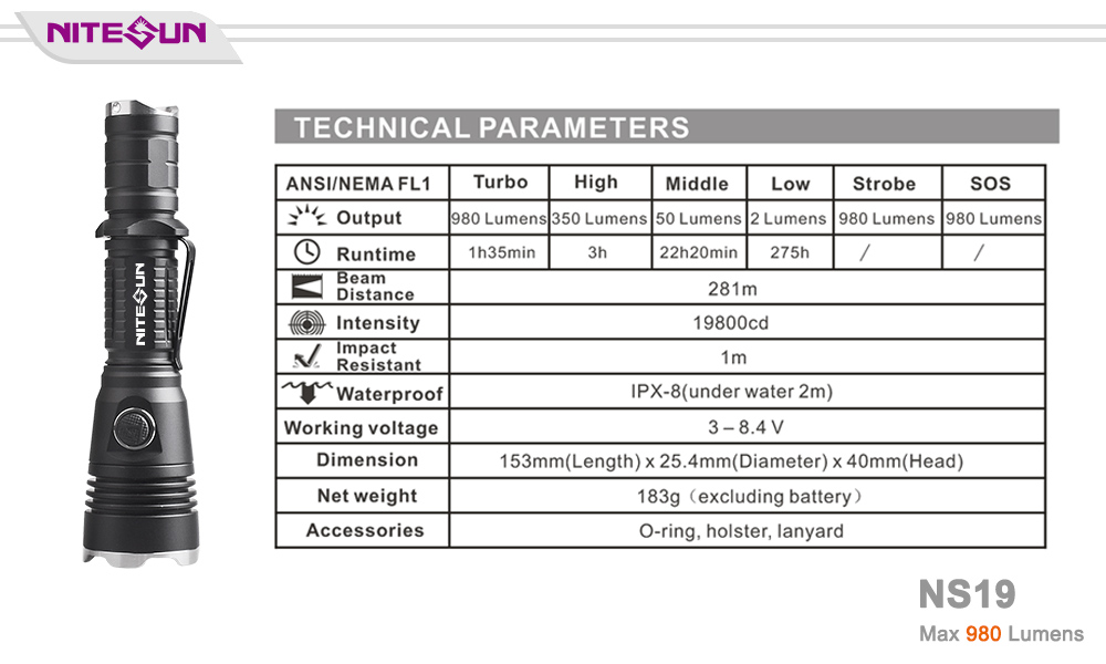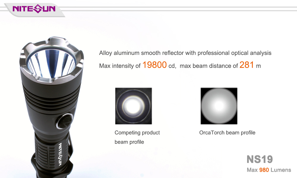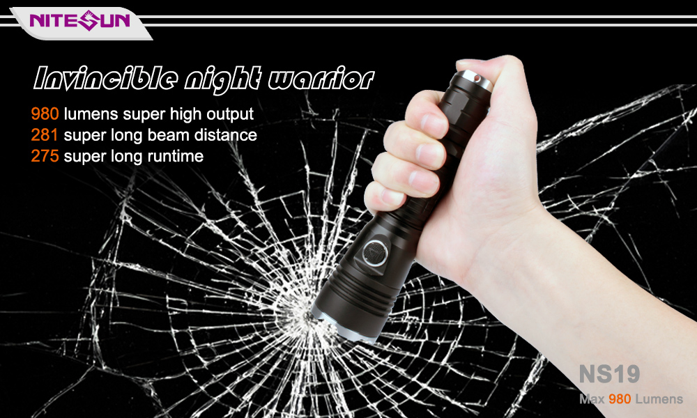 ULTRA-BRIGHT: Nitesun NS19 is a standard tactical flashlight, 980 lumens Cree LED providing an amazing (281 m/ 922 ft) throw with a fairly wide usable spill.
