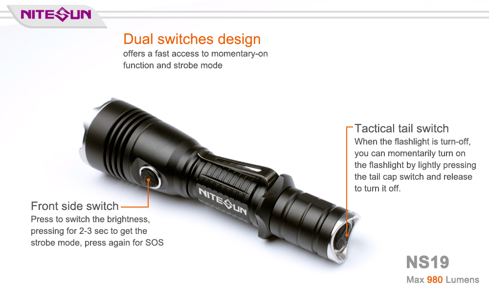 Nitesun NS19 is a high output LED flashlight specially designed for police and soldier with the newly-developed tactical tail switch and front side switch system. When the flashlight is off, you can momentarily turn on the flashlight by lightly pressing the tail switch; when the light is on, you can get strobe mode by pressing the side switch directly. It offers four brightness levels, strobe and SOS mode, max 980 lumens output, runtime nearly 275 hours. Plus its simple style appearance, robust construction, and IPX-8 standard waterproof feature.